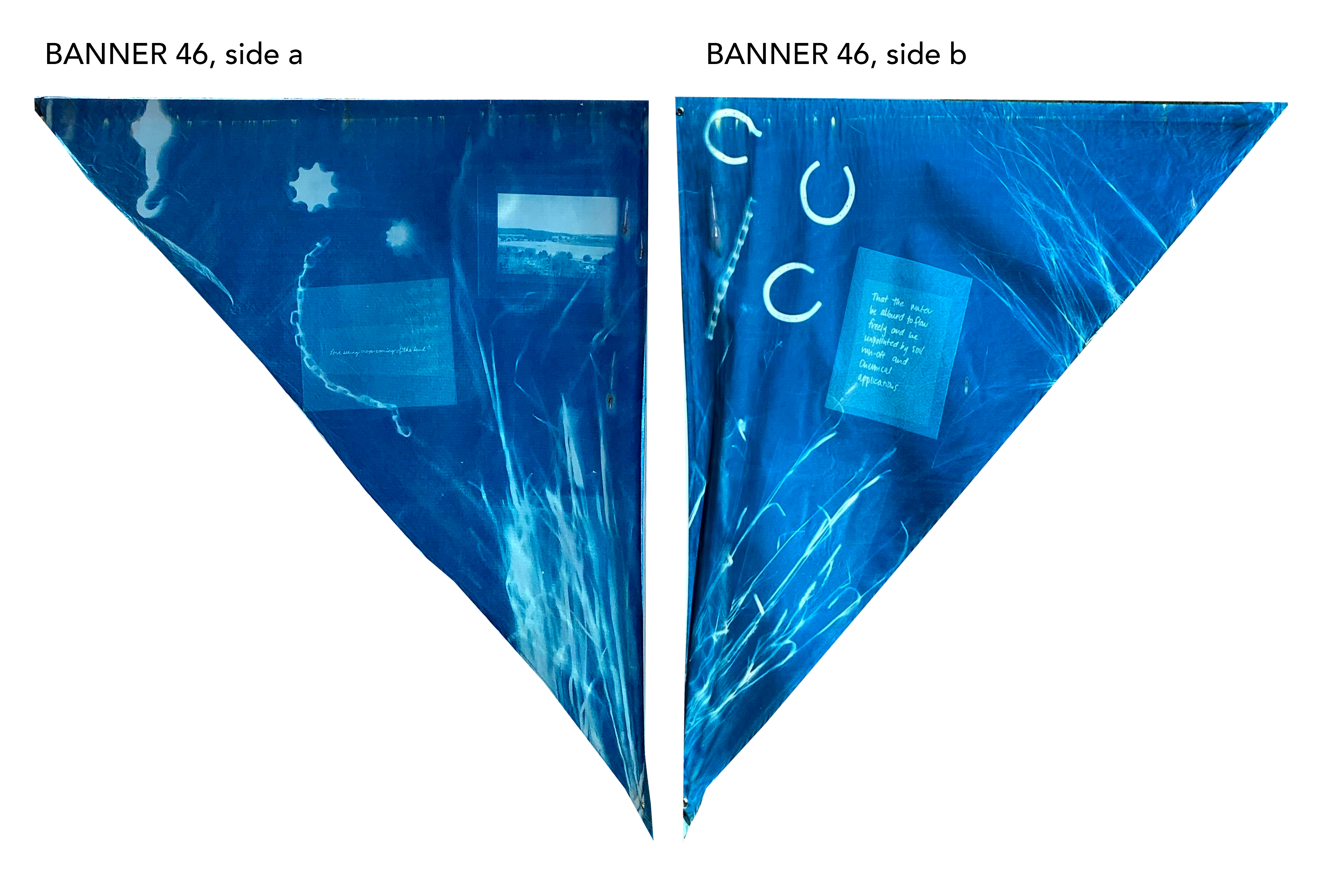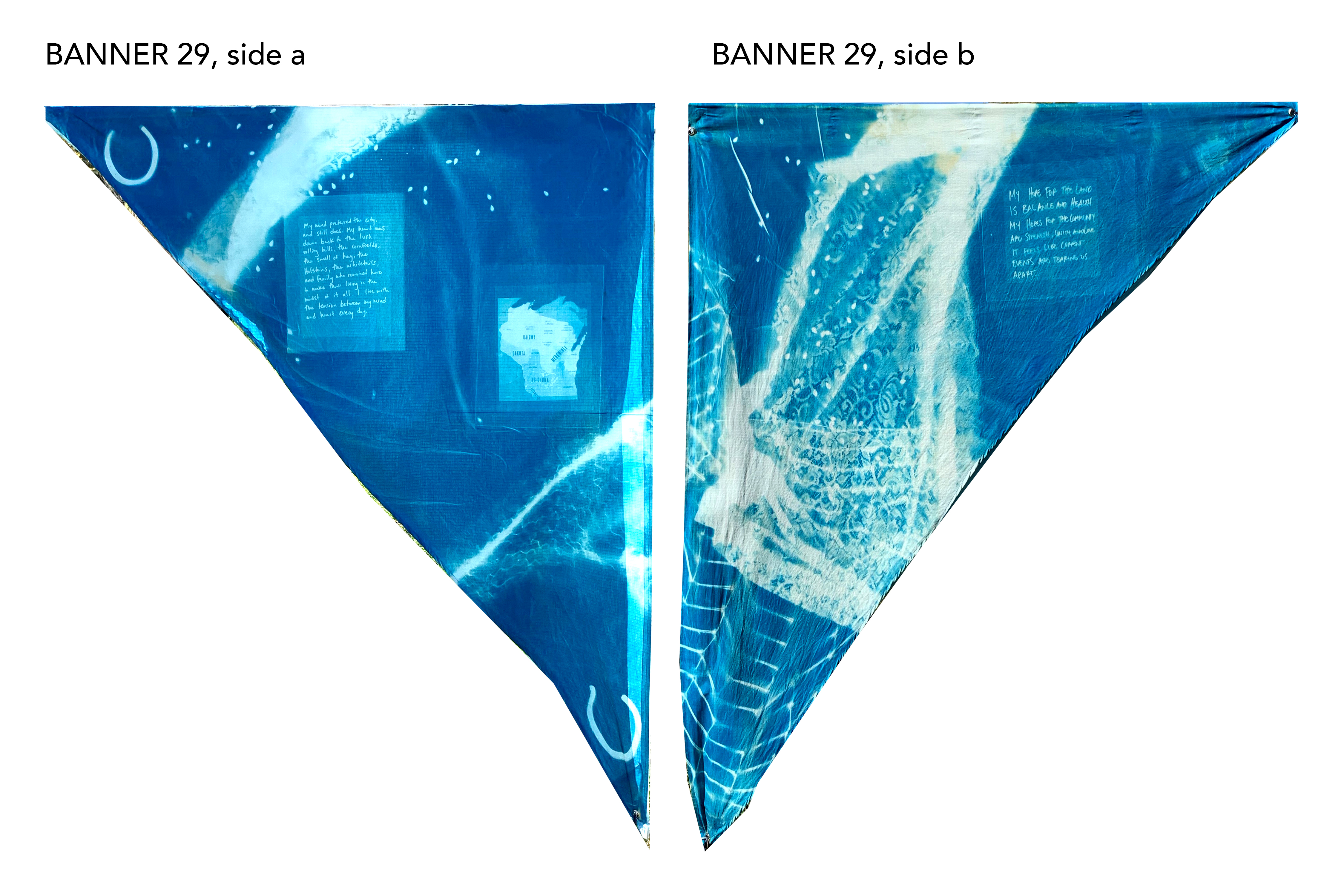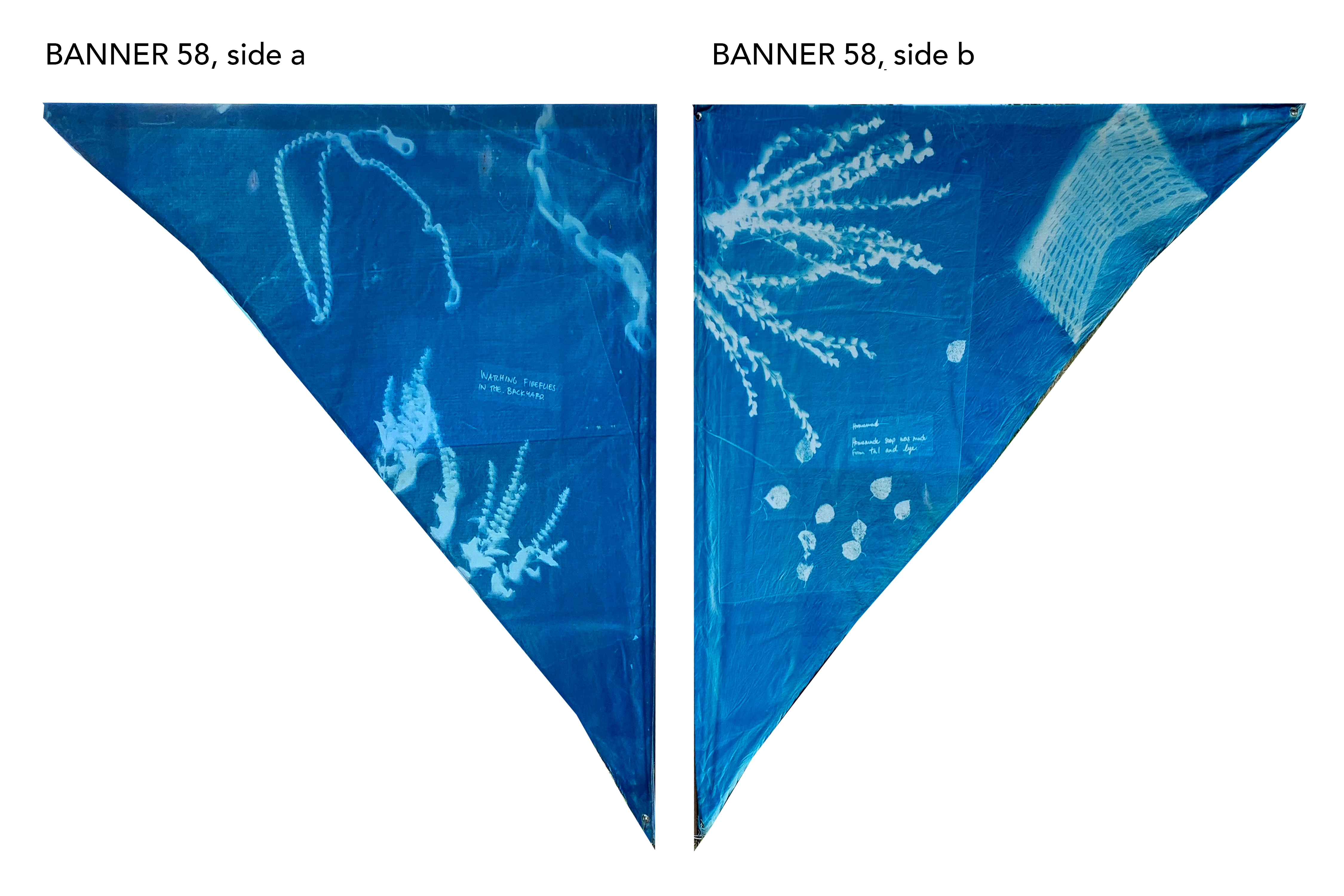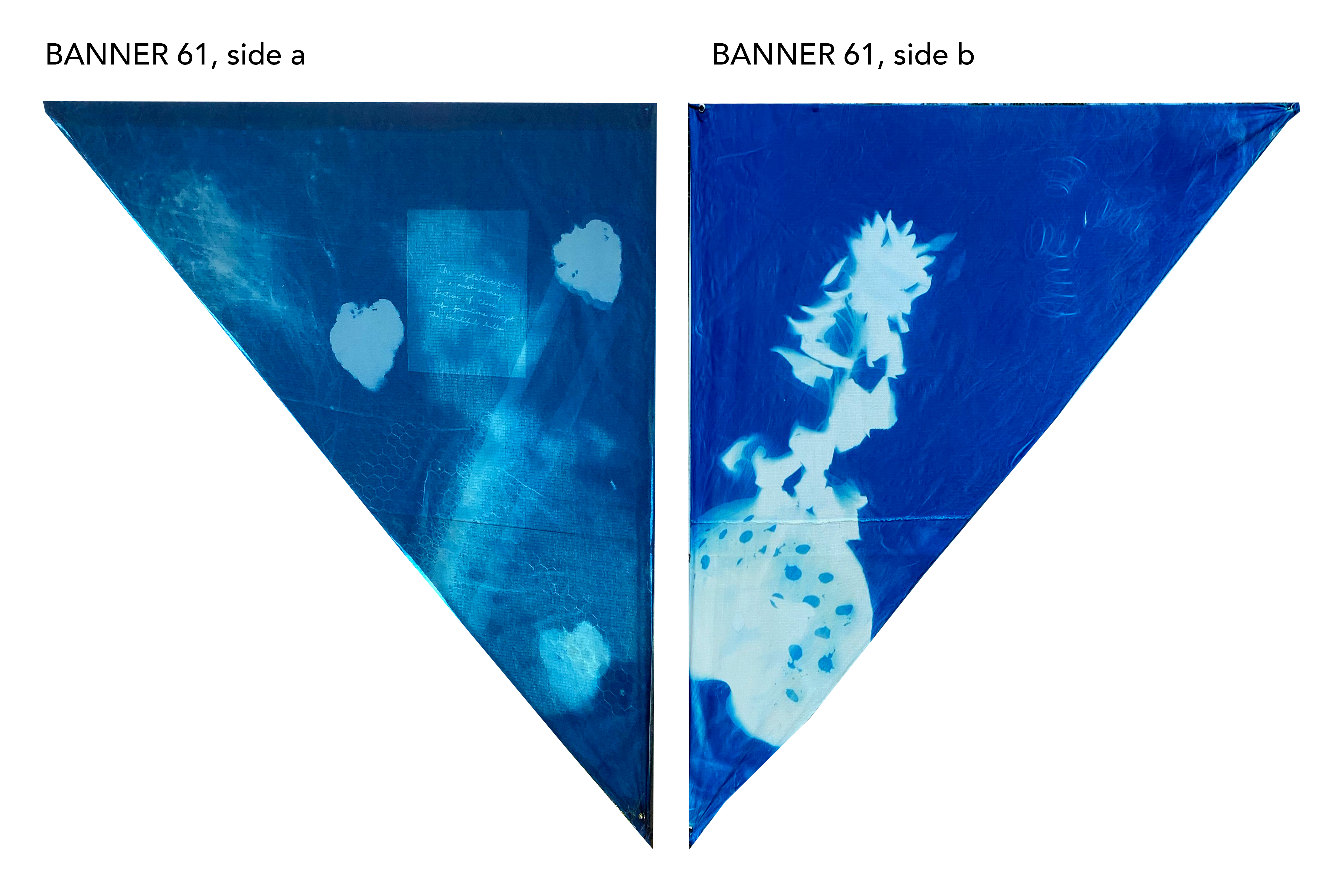 All banners are 5.5’ tall x 4.5’ wide, made with 100% Cotton Ripstop Fabric and prepared with a Cyanotype Emulsion.